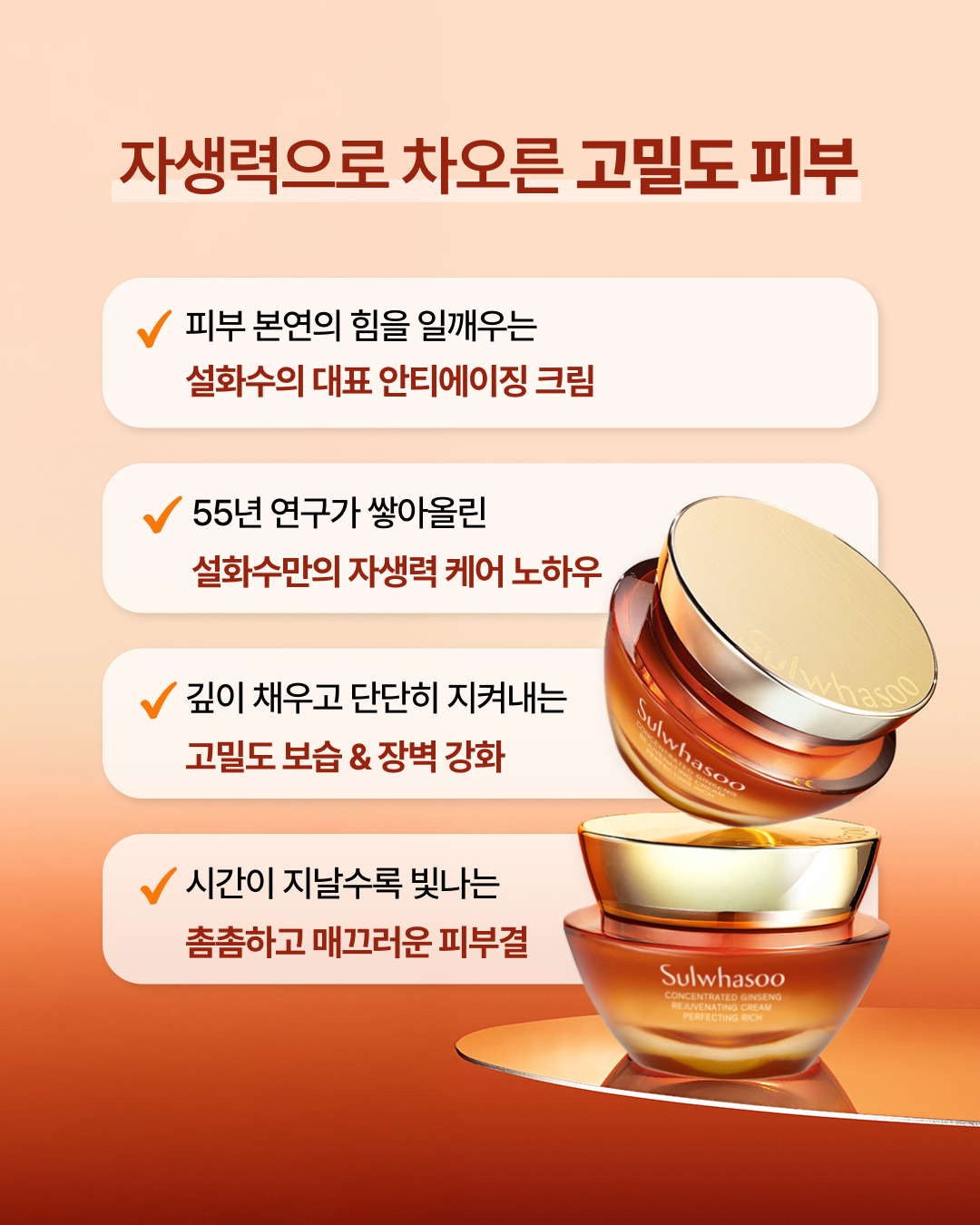 설화수 자음생크림 퍼펙팅 리치는 단순히 보습에 머무르지 않고, 피부 본연의 힘을 깨워 시간이 지날수록 더 빛나는 피부를 만들어줍니다. 55년간 쌓아온 설화수의 연구와 기술력이 집약된 이 크림은, 단순한 스킨케어 제품을 넘어 미래의 피부 건강을 위한 투자라고 할 수 있습니다.